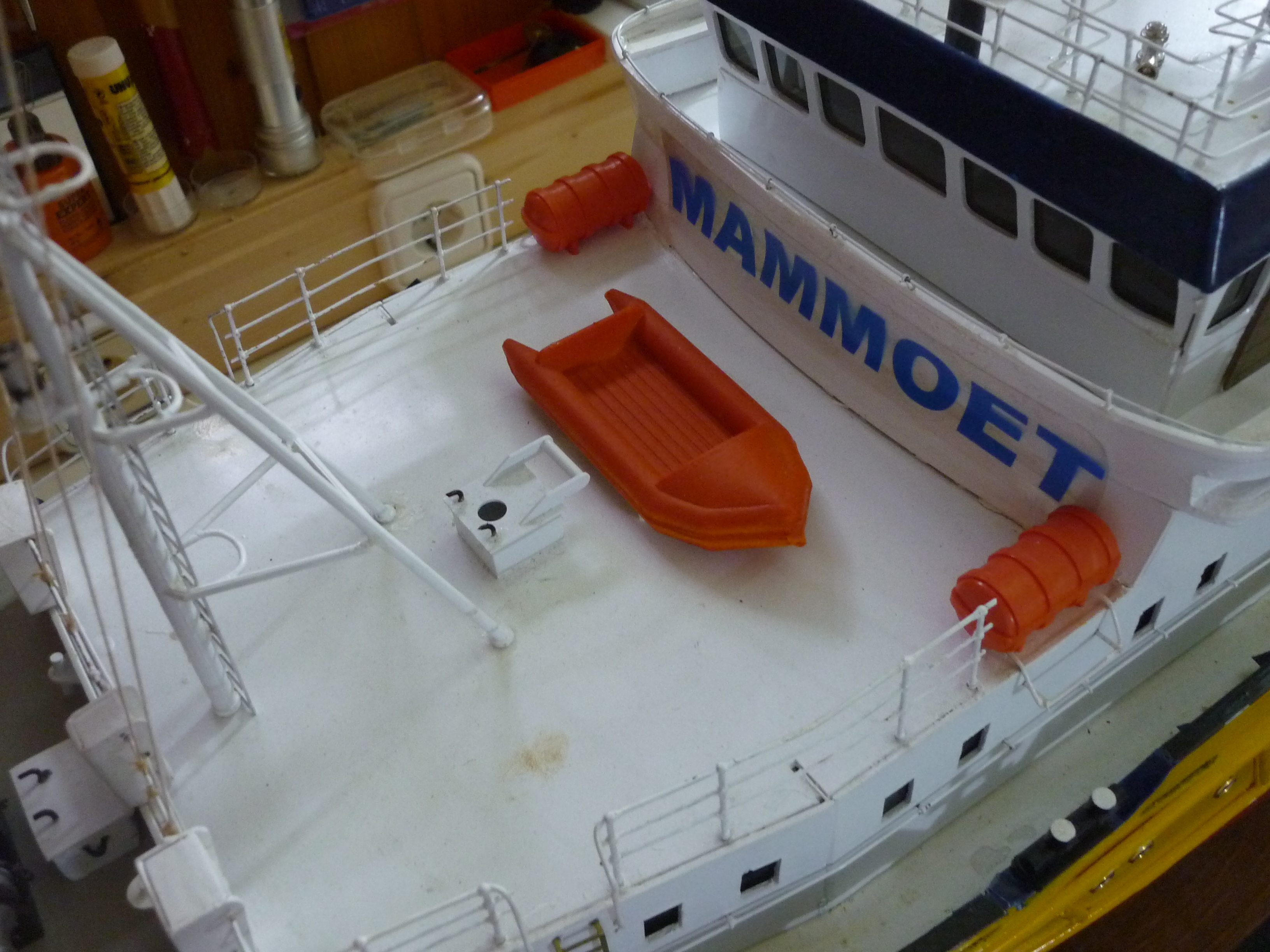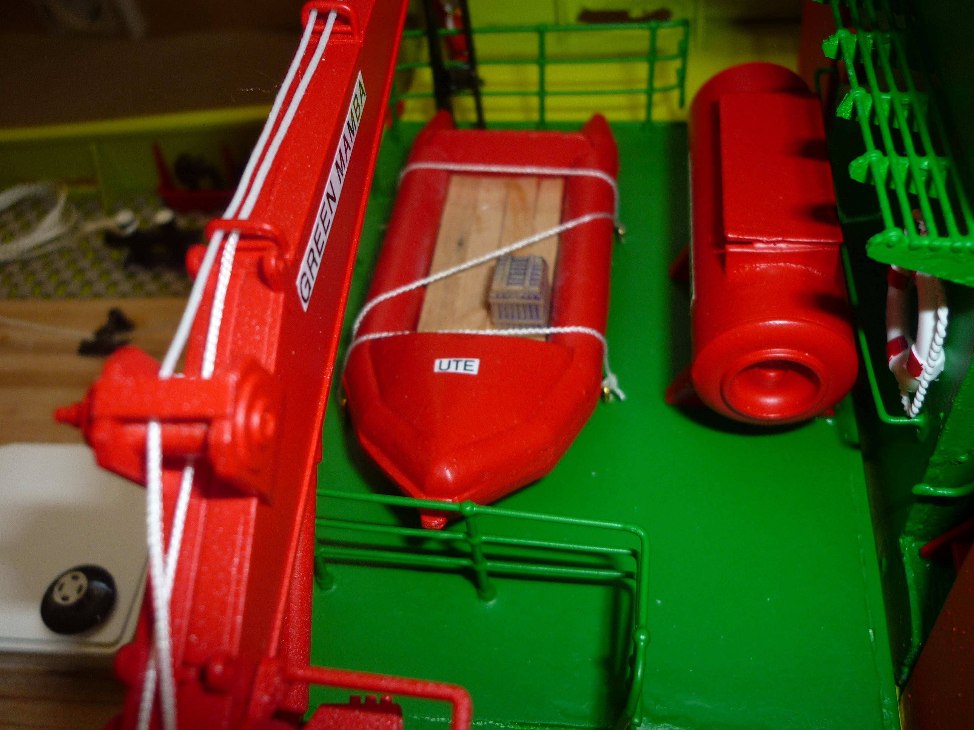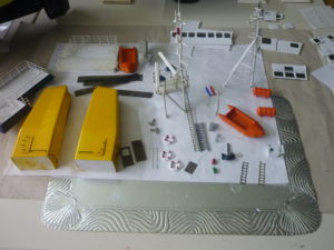Auch die Opferanoden und Beschriftungen werden angebracht. ( Kran, Beiboote, Kessel usw. ). Ein Beiboot erhält den Namen meiner Ehefrau Ute das Andere den Namen meiner Tochter  Vanessa.