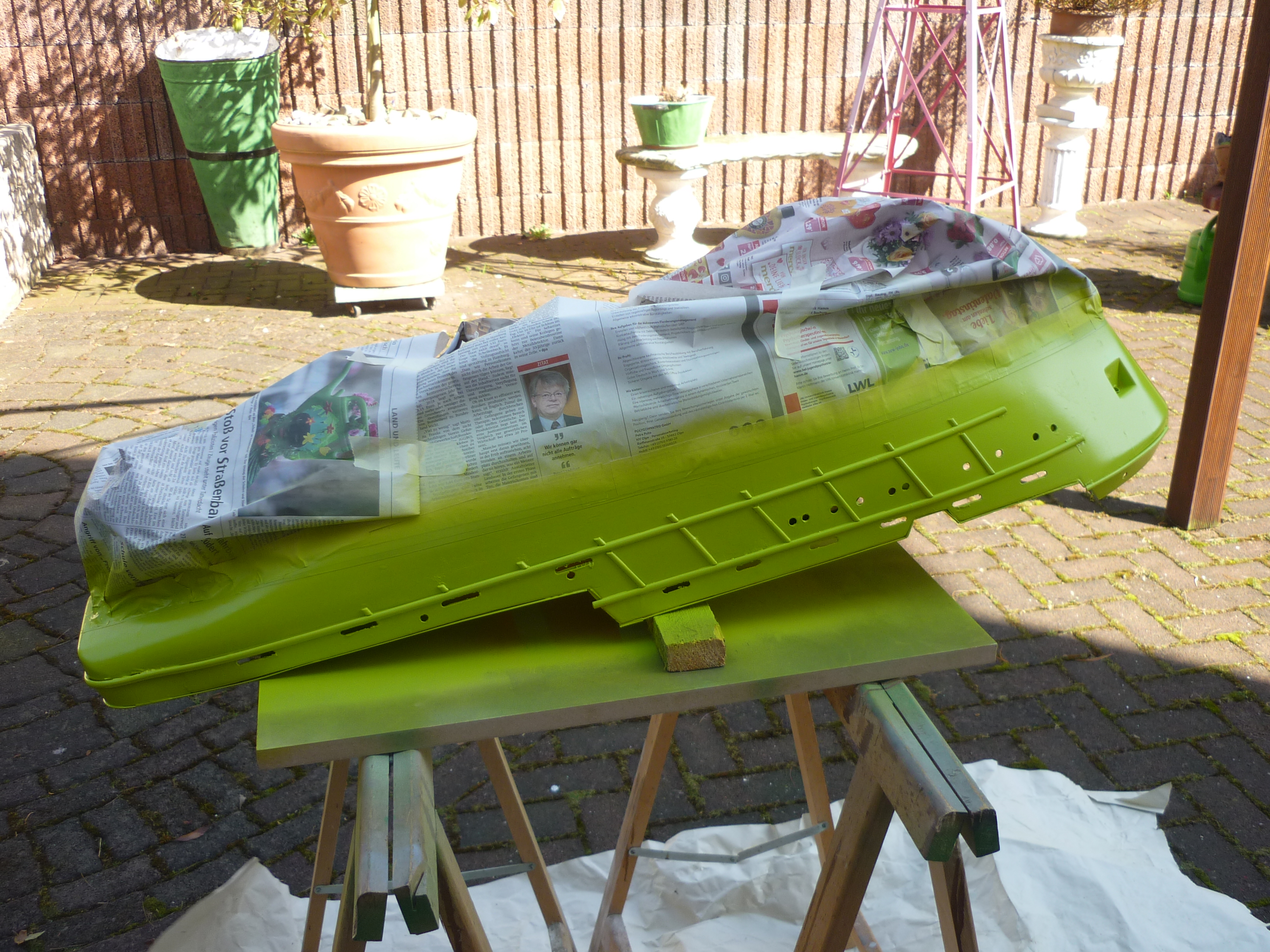 Nachdem die Arme immer länger wurden –  Schleifarbeiten endlich beendet. Jetzt geht es nach draußen zum  “ –  Spritzen – “ . Als Farben verwende ich – Belton Molotow Premium Original Urban Art Spray Paint -. Sie sind für mich die – Besten -, da sie hohe Pigmente haben und daher nicht verlaufen. Außerdem trocknen sie schnell und sind sehr gut deckend. Eine Schicht reicht aus. Allerdings sollte man beim “ Spritzen “ immer in Bewegung bleiben. Noch ein Vorteil dieser Farben:  Sie kann man auch bei Frost verwenden und zudem haben sie noch einen unschlagbaren Preis.