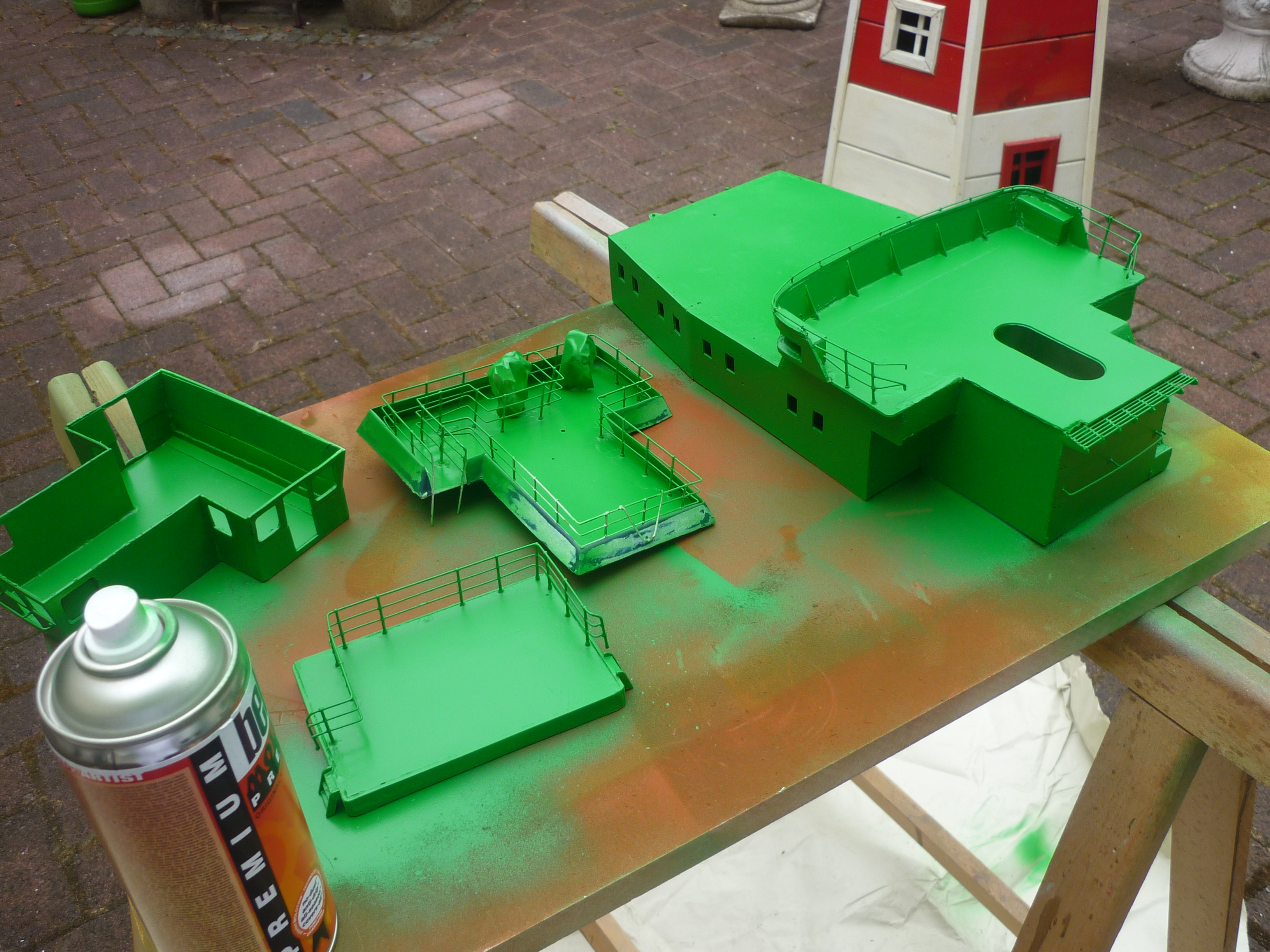 Da noch einige “ Spachtelungen “  trocknen müssen wurde schon ein Teil gepritzt. ( Leitern-Rettungsboote-Schornsteine-Rettungsinseln-Gastank-Masten )